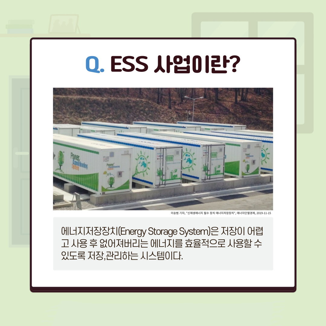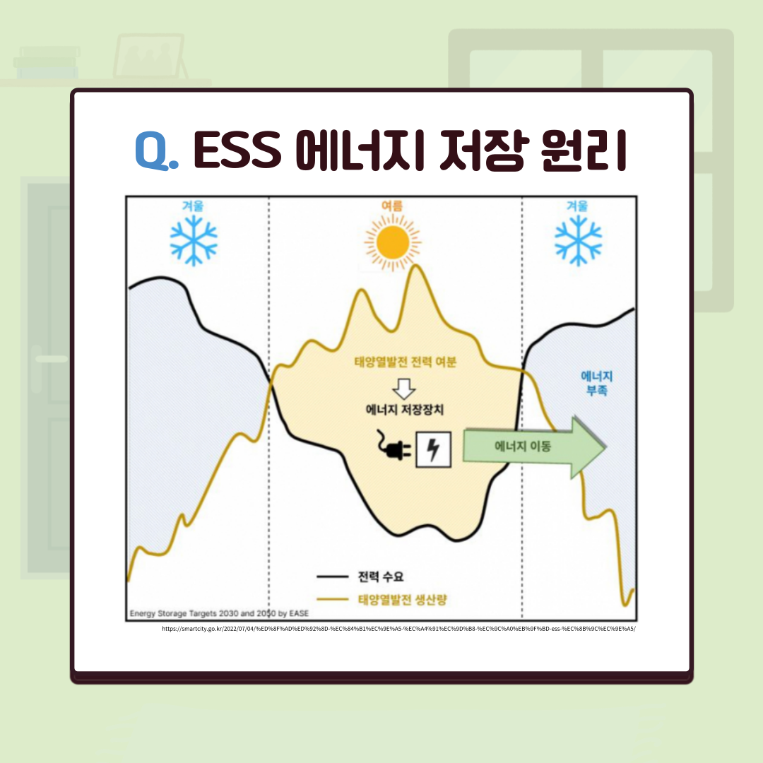 ESS는 기후 여건이 좋을 때 생산된 에너지를 장기간 저장해두고 기후 여건이 좋지 않을 때 에너지를 사용할 수 있도록 만든 장치로 불규칙한 날씨 영향으로 인해 하루 에너지 생산량이 일정하지 않을 때 재생에너지 지원을 효과적으로 활용할 수 있게 해주는 원리를 가지고 있다.