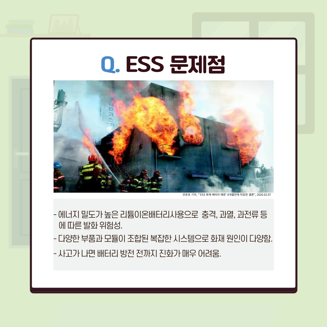 앞서 말한 많은 장점들에도 불구하고 ESS 시스템에는 해결해야 할 문제점이 있다. 지난 2017년부터 처음 시작한 ESS 화재 사고는 최근까지 총 37건이 발생하고 있다. 이를 방지하기 위해 소방시설과 각종 관리 체제를 도입했지만 화재는 여전히 발생하고 있는 상황이다. 화재의 원인으로는 다양한 의견이 있는데 무엇보다 ESS 시스템에 대한 세부 규정이 없고 특히 과거에 설치된 ESS에 대한 대책이 없는 것이 현 상황이다. ESS의 장점을 활용하여 에너지 저감을 하기 위해선 화재 안정성을 검증할 인프라와 시스템을 구축해야 할 것으로 보인다.