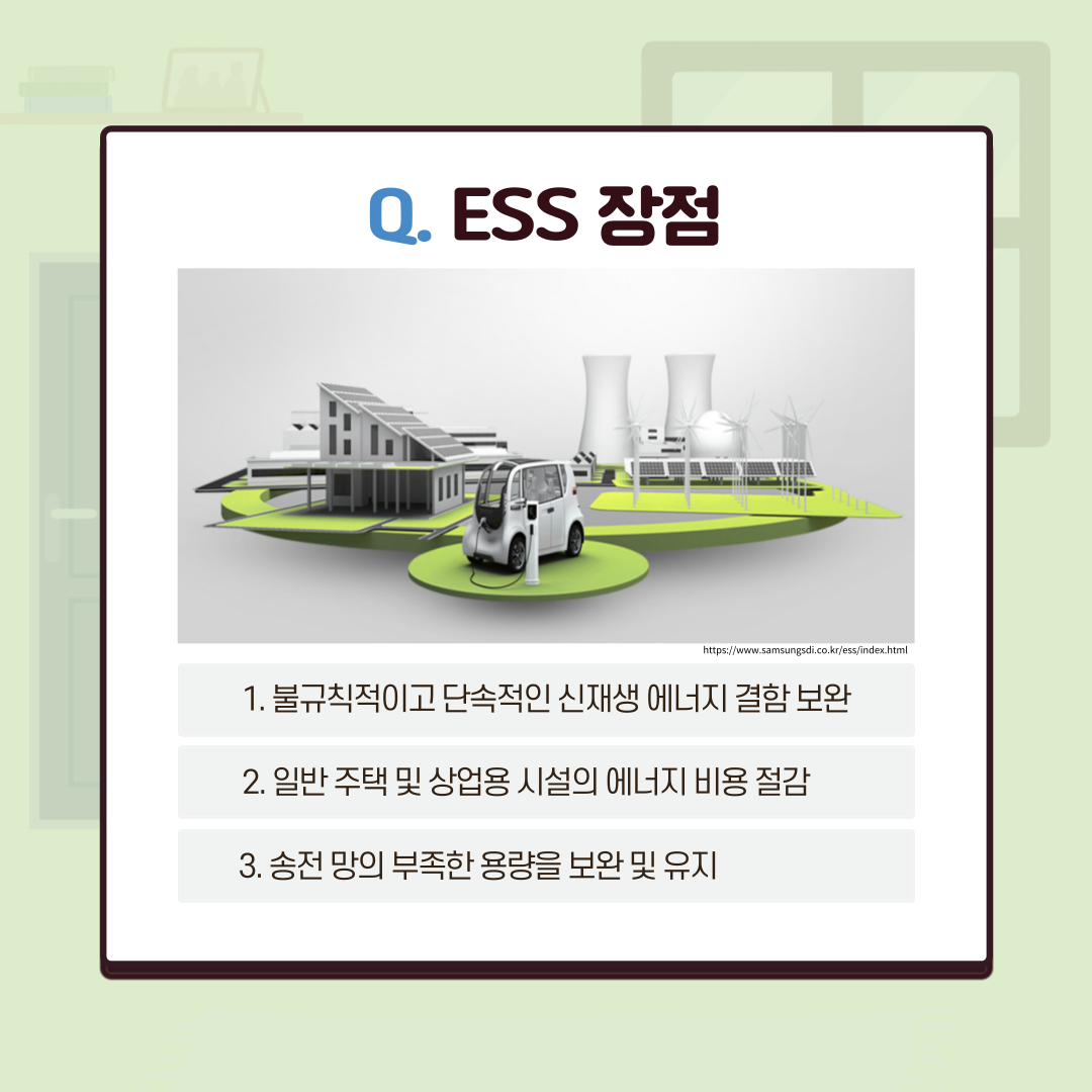 ESS(에너지 저장 장치)는 태양광⦁풍력발전을 통해 생산한 전기나 값싼 심야 전기를 배터리에 저장했다가 쓸 수 있도록 저장하는 장치를 이야기한다. 이 장치는 발전소, 송배전시설, 가정, 공장, 기업 등에서 활용이 가능하며 최근 신재생에너지와 연계 시스템으로 신재생 에너지의 효율을 높여 전기료를 절감하거나 정전 피해를 최소화하는 백업 전력으로 사용이 가능한 특징을 가지고 있다.