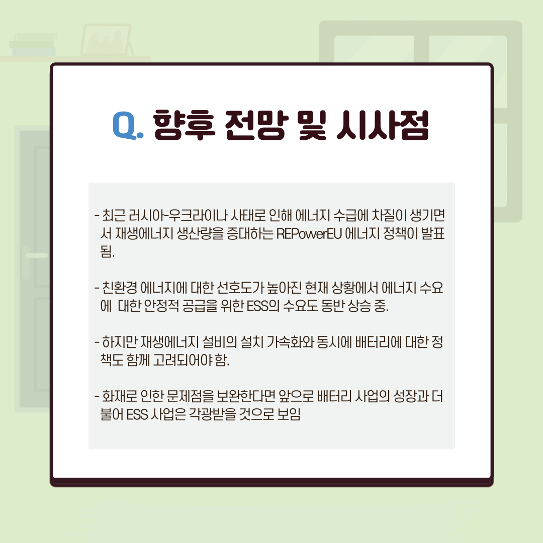 태양광, 풍력 발전과 같은 친환경 에너지에 대한 선호도가 높아지면서 에너지 수요에 대한 안정적 공급을 위해 ESS(에너지 저장 장치)에 대한 수요도 높아지고 있는 추세이다. 최근 전기차의 수요도 증가하면서 배터리의 활용도도 높아질 전망이다. 이러한 상황에서 ESS 시스템을 통한 효율적 에너지 사용과 에너지 절약이 가능해질 날을 기대해 본다.