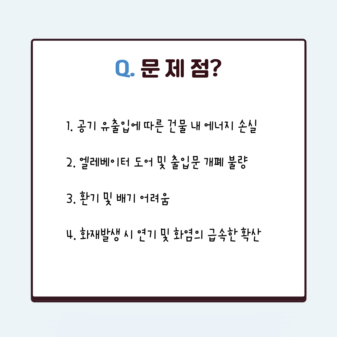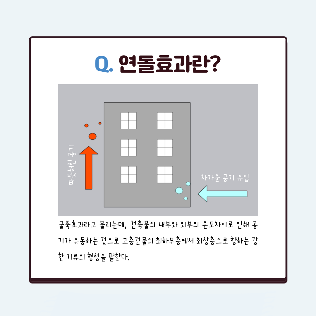 우리나라의 고층 건물에 강풍이 몰아치는 날에 창문이 깨지거나 문이 닫히지 않는 현상이 자주 나타나고 있다. 이러한 현상은 ‘연돌효과’로 인해 발생하는 문제이다.