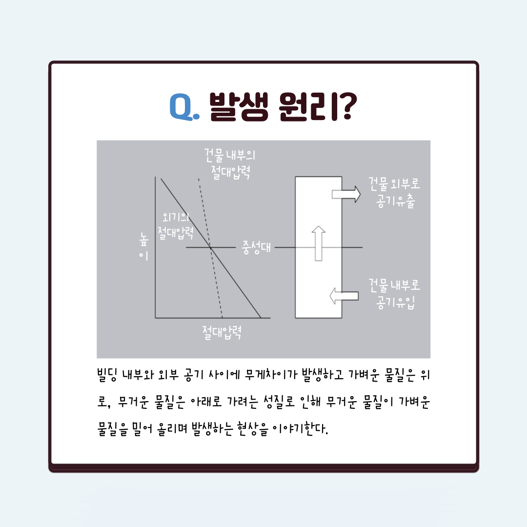 연돌효과가 발생하는 원리는 무거운 물질은 아래로, 가벼운 물질은 위로 가는 성질에 의한 것인데 여러 물질이 혼재되어 있는 경우 상대적으로 무거운 물질이 아래로 내려가면서 가벼운 물질을 밀어 올리는 현상이 그 원인이다. 앞선 원리를 건물에 적용해 봤을 때 겨울철 난방으로 인해 따뜻해진 실내의 공기는 차가운 외부 공기보다 상대적으로 가벼워 무게 차이로 인한 연돌효과가 발생하게 되는 것이다.