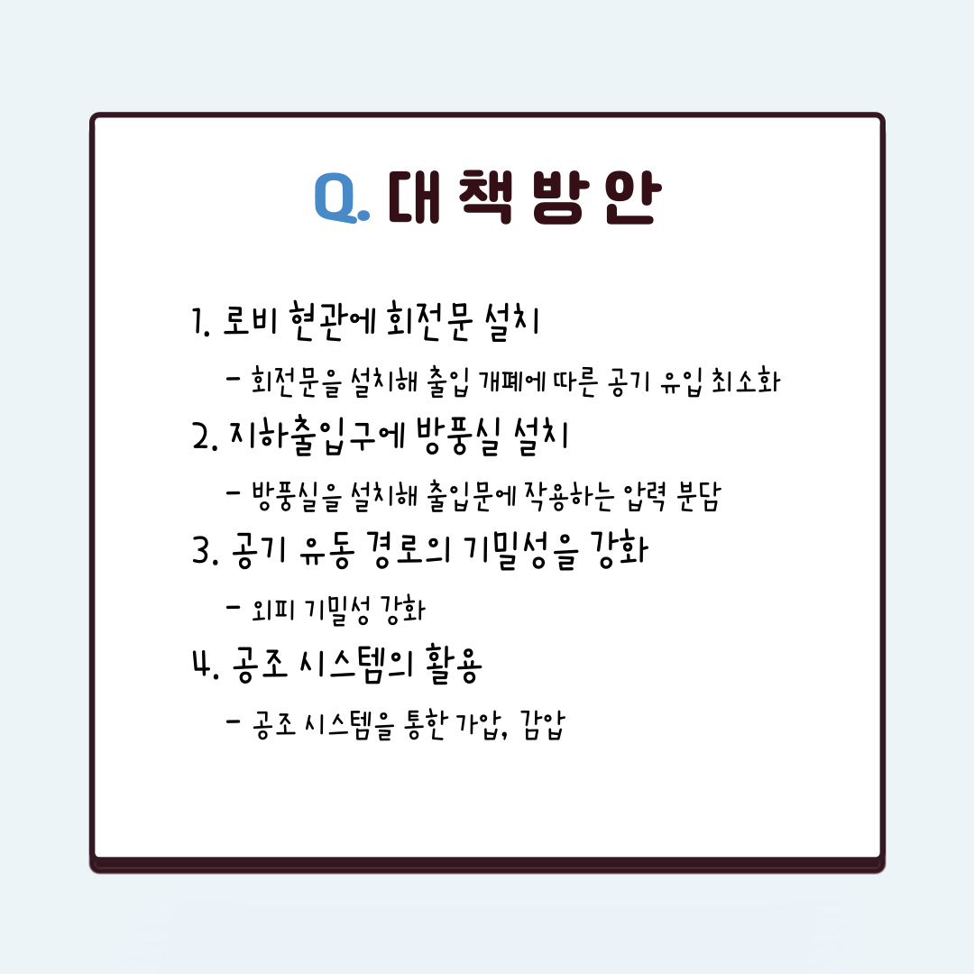 이러한 문제점으로 인한 피해를 최소화하기 위해 연돌효과로 인해 발생하는 다양한 문제점들을 해결할 수 있는 대책 방안이 필요하다. 그 해결 방안으로는 첫째, 로비 현관에 회전문을 설치하여 출입 개폐 시 공기 유입을 최소화한다. 둘째, 지하실 출입구에 방풍실을 설치하여 출입문에 작용하는 압력을 분담한다. 셋째, 외피의 기밀성을 강화해 공기 유동 경로를 차단한다. 마지막으로 공조 시스템을 활용하여 가압이나 감압을 통해 연돌효과를 해결하는 방법 등이 있다.